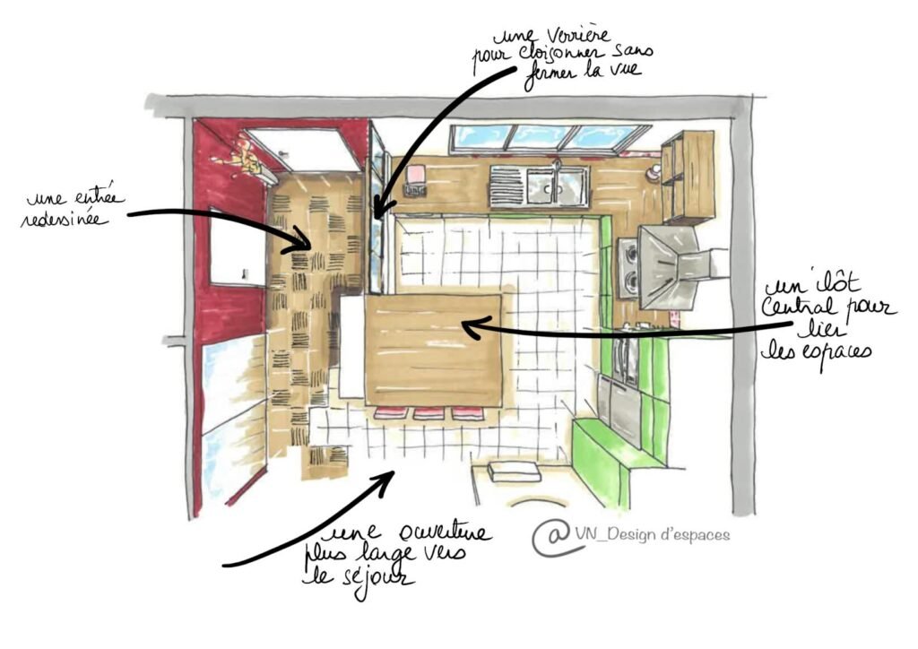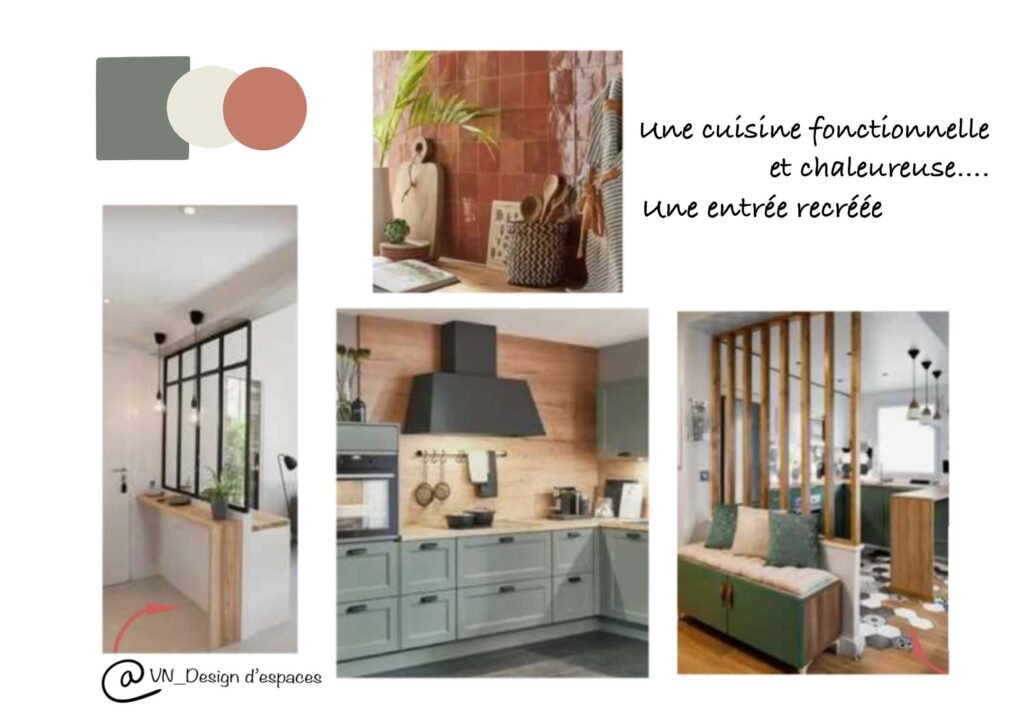 Voici comment en supprimant une cloison, on peut redonner une identité et une vraie fonction aux espaces nouvellement créés. Les clients souhaitaient revoir l’aménagement de leur cuisine et nous avons construit un projet plus global en redessinant l’entrée et l’accès vers le séjour. Un beau projet pour créer du lien !